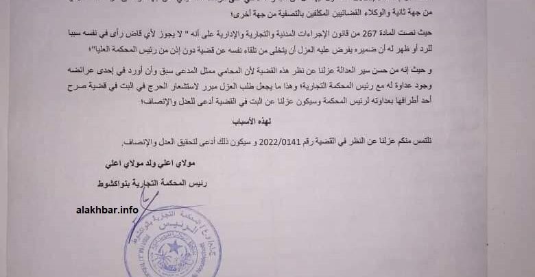واستدل ولد مولاي اعلي بنص المادة 267 من قانون الإجراءات المدنية والتجارية الذي يقول إنه “لا يجوز لأي قاض رأى في نفسه سببا للرد أو ظهر له أن ضميره يفرض عليه العزل أن يتخلى من تلقاء نفسه عن قضية دون إذن من رئيس المحكمة العليا”.وذكر ولد مولاي اعلي في رسالته أن محامي المدعى سبق وأن أورد في إحدى عرائضه وجود عداوة بينه وبين رئيس المحكمة التجارية، وهو ما اعتبره مبررا في طلب العزل لاستشعار الحرج في البت في القضية