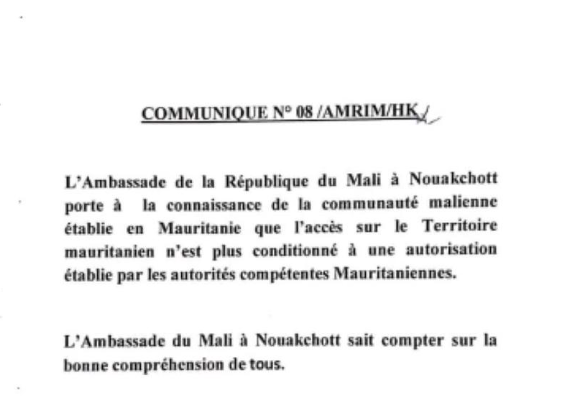 أبلغت السفارة المالية في نواكشوط مواطنيها برفع اشتراط رخصة الدخول للعبور إلى الأراضي الموريتانية.
