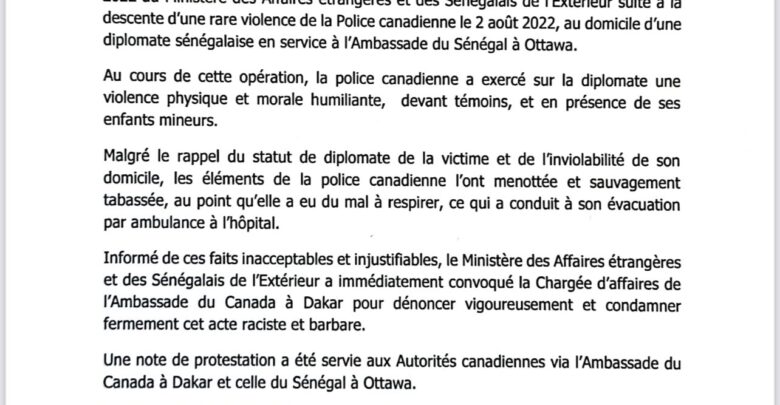 واتهمت السنغال الشرطة الكندية بممارسة “العنف الجسدي والمعنوي” على دبلوماسيتها “أمام شهود وبحضور أطفالها القصر”.