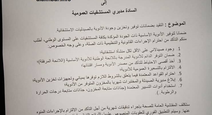 كما طالبت الوزارة في تعميمها بأخذ أقصى الاحتياط للتأكد من مصدر الأدوية ومسار اقتنائها؛ والالتزام بالتسعيرة العمومية للأدوية؛ بالإضافة إلى احترام القواعد المعتمدة فيما يتعلق بالشروط اللازم توفرها بمباني وتجهيزات تخزين الأدوية؛