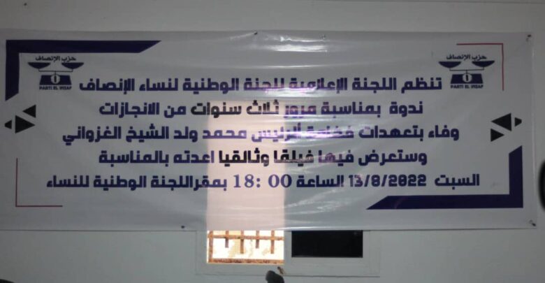 تلماس : أقامت اللجنة الإعلامية للجنة الوطنية لنساء حزب الإنصاف الحاكم مساء اليوم السبت ندوة بمناسبة حلول ذكرى تنصيب رئيس الجمهورية محمد ولد الشيخ الغزواني.
