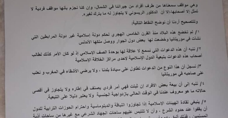 واعتبرت أن هذا النوع من الدعوات “تطاول على سيادة بلدنا ، ولا يرضي الأشقاء في المغرب و نعتب على صاحبه في موريتانيا”، منبهة إلى أن هذه الدعوات التي نسمع لا علاقة لها بوحدة الصف الإسلامي إذ لو كان الأمر كذلك لطالب أصحاب هذه الدعوات بتبعية الدول الإسلامية لإحدى مراكز الخلافة الإسلامية”، حسب البيان.