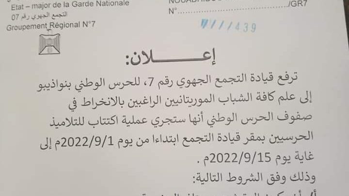 أعلنت قيادة التجمع الجهوي رقم 7 بداخلت نواذيبو عن عملية اكتتاب للشباب الراغبين في الإلتحاق بصفوف الحرس الوطني.