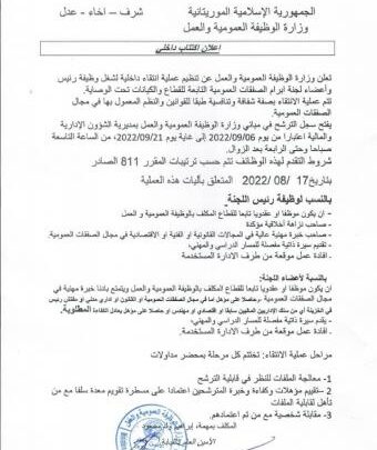 وحسب الإعلان يفتح سجل الترشح في مباني وزارة الوظيفة العمومية والعمل بمديرية الشؤون الإدارية والمالية اعتبارا من يوم 2022/09/06 إلى غاية يوم 2022/09/21، من الساعة التاسعة صباحا وحتى الرابعة بعد الزوال.