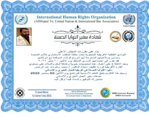يعلن المجلس الاستشاري و الاقتصادي والاجتماعي للأمم المتحدة برآسة السيدة/ *سوسن مبروك، عن تكريم النائب عن دائرة آسيا وسفير النيات الحسنة/ الدكتور محمد سالم عبد الرحمن “ابوعبدالرحمن”.. بمناسبة توشيحه، من طرف المجلس الاستشاري والاقتصادي والاجتماعي للأمم المتحدة، بدرع الاستحقاق، وشهادة سفير النيات الحسنة-