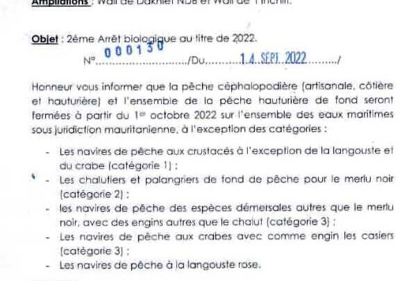 ووفق التعميم فإن التوقيف البيولوجي سيبدأ في1 أكتوبر في عموم المياه الإقليمية الموريتانية.