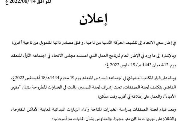 وأضاف بيان صادر عن الاتحاد أن عملية الشراء تمت بناء على قرار المكتب التنفيذي في 18 أغسطس الماضي يقضي بتكليف لجنة الصفقات بالبت في الخيارات المطروحة بشأن مقهى الأدباء، والعمل على إطلاقه في أقرب وقت ممكن.