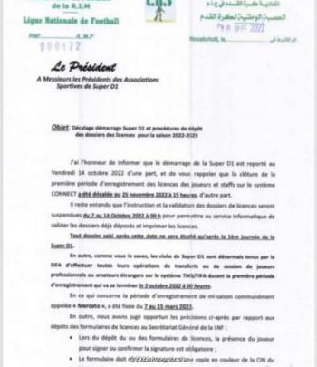 ألزمت العصبة الوطنية التي تتولى إدارة المسابقات الكروية في موريتانيا، الأندية المحلية، بضرورة إحضار اللاعبين لمقر اتحاد كرة القدم، وذلك أثناء تسجيل عقودهم أو تأكيد التوقيع على رخصة الموسم.