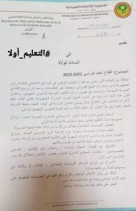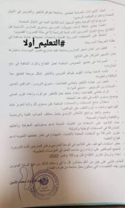 وجهت وزارة التهذيب الوطني تعميما الى كافة الولاة دعتهم الى التأكد من قيام جميع المديرين الجهويين للتعليم بتسجيل تلاميذ السنة الاولى ابتدائية حصرا على المدراس النظامية وابلاغ المدارس الخاصة بمنع استقبالهم.
