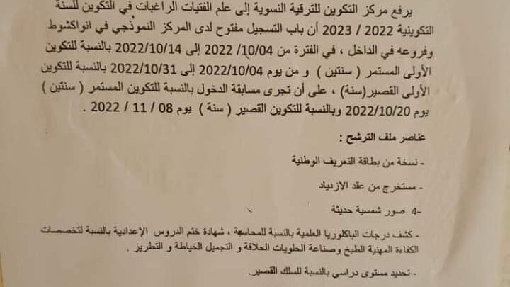 يرفع مركز التكوين للترقية النسوية إلى علم الفتيات الراغبات في التكوين للسنة التكوينية 2022 / 2023 أن باب التسجيل مفتوح لدى المركز النموذجي في انواكشوط وفروعه في الداخل ، في الفترة من 10/04/ 2022 إلى 2022/10/14 بالنسبة للتكوين الأولى المستمر ( سنتين ) و من يوم 2022/10/04 إلى 2022/10/31 بالنسبة للتكوين الأولى القصير (سنة) ، على أن تجرى مسابقة الدخول بالنسبة للتكوين المستمر ( سنتين ) يوم 2022/10/20 وبالنسبة للتكوين القصير ( سنة ) يوم 08 / 11 / 2022