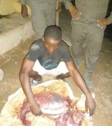 دورية من الحرس تضبط اجنبي من دولة سراليون يقطع شاة ميتة جيفة منذ يوم او إثنين و في وقت متاخر من الليل و من المتوقع انه كان ينوى بيعها في السوق
