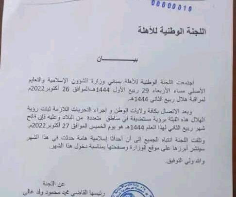 افادة لجنة مراقبة الاهلة بانها توصلت لما يثبت هلال ربيع الثاني برؤية مستفيضة و عليه فإن فاتح الشهر سيكون الخميس 27 اكتوبر 2022