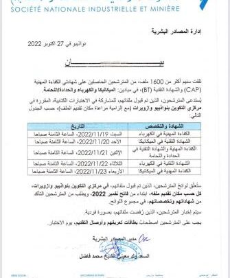 وأوضحت مديرية المصادر البشرية بشركة “سنيم”، في بلاغ لها ، انها تلقت ما يزيد على 1600 ملف ترشح؛ مبينة أن جدول الاختبارات حدد على النحو التالي: