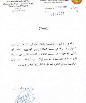ترفع وزارة الشؤون الإسلامية والتعليم الأصلي، إلى علم المترشحين للمشاركة في مسابقة “جائزة رئيس الجمهورية لحفظ وفهم المتون المحظرية” في نسختها الثالثة، أن التصفية الأولى من المسابقة تقرر إجراؤها على مستوى عواصم الولايات أيام الجمعة، السبت، الأحد 24/25/26/ ربيع الثاني، الموافق: 18/19/20/ نوفمبر 2022 م