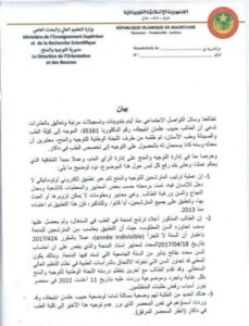 6- أخيرا، نلفت انتباه الرأي العام الوطني إلى أن قطاع التعليم العالي والبحث العلمي، اختار نهج الشفافية والعدالة والمساواة بين المواطنين والإنصاف في تأدية المهام المنوطة به لفائدة جميع الموريتانيين بما في ذلك مختلف الطلاب. ولذا يرجو القطاع من الجميع توخي الموضوعية والمصداقية فيما يتم تداوله ونشره من أخبار ومعلومات تخص المسائل المتعلقة بمهام الوزارة، مؤكدين في نفس الوقت استعدادنا لاستقبال كل من يهتم بالمواضيع التي تتعلق بمهامنا وتزويده بالمعلومات الصحيحة.