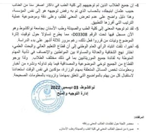 5- لقد تم توجيه المعني إلى كلية الطب والصيدلة وطب الأسنان بجامعة نواكشوط وهو الآن مسجل فيها تحت الرقم D03308، مما يطرح تساؤلا حول توقيت إثارة الموضوع ونوايا من قرروا فعل ذلك، رغم مرور ثلاثة أشهر على بدء الدراسة.