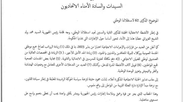 طالب حزب الإنصاف الحاكم في موريتانيا هيئاته على مختلف المتسويات بتنظيم فعاليات ومهرجات ونقاشات بخصوص المواضيع الواردة في خطاب الرئيس محمد ولد الغزواني بمناسبة الذكرى 62 للاستقلال الوطني.