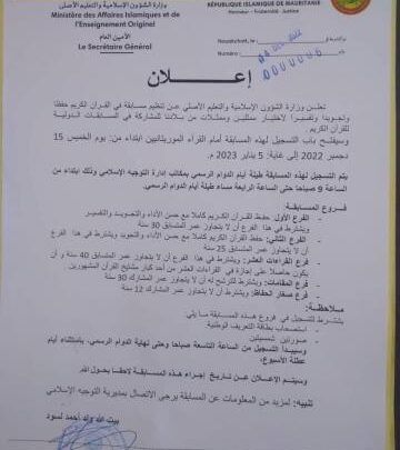 وقالت الوزارة في إعلان نشرته أمس إن باب التسجيل لهذه المسابقة سيفتح أمام القراء الموريتانيين ابتداء من يوم الخميس 15 دجمبر 2022 إلى غاية 5 يناير 2023 م.
