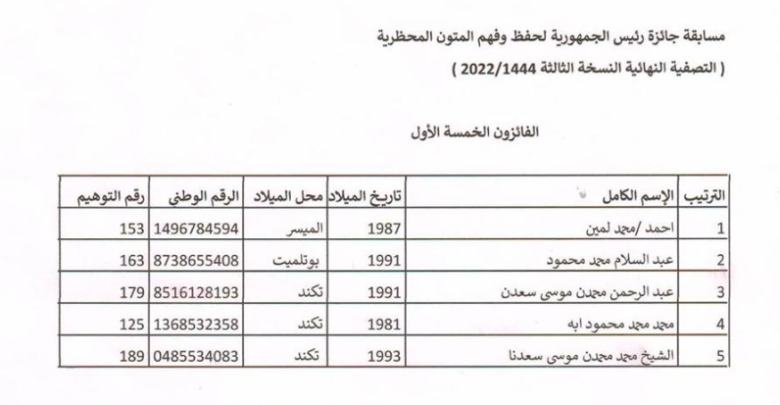 أعلن اليوم الاثنين عن الفائزين الخمسة الأوائل في التصفية النهائية للنسخة الثانية من «مسابقة رئيس الجمهورية لحفظ وفهم المتون المحظرية».