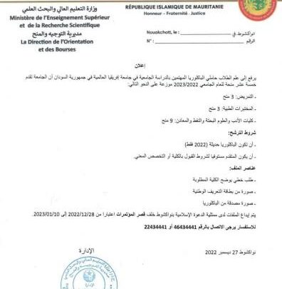 أعلنت وزارة التعليم العالي اليوم عن توفر 15 منحة بجامعة إفريقيا العالمية في جمهورية السودان، لصالح الطلاب الموريتانيين حاملي الباكاوريا 2022.