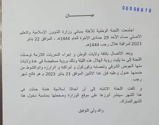 اعلنت لجنة مراقبة الاهلة ان الاثنين 23يناير 2023 فاتح شهر رجب للعام 1444