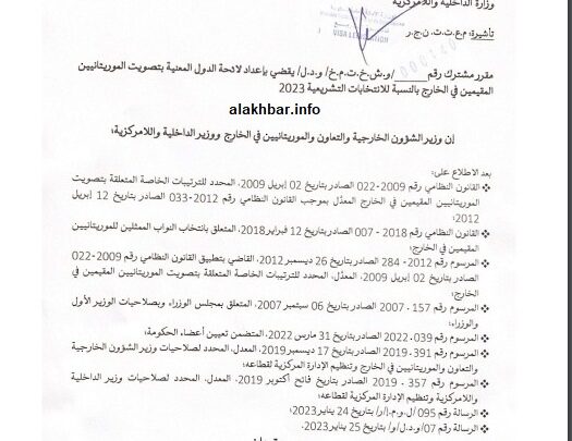 وقع وزيرا الداخلية واللا مركزية محمد أحمد ولد ولد محمد الأمين، والخارجية محمد سالم ولد مرزوك مقررا مشتركا حددا بموجبه ثماني دول في أربع قارات، يحق للجاليات الموريتانية فيها التصويت في الانتخابات القادمة.