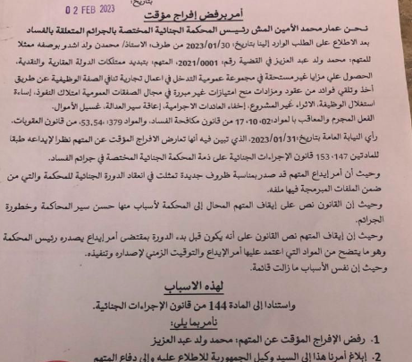 وجاء في قرار المحكمة أن المتهم ولد عبد العزيز أودع السجن طبقا للمادتين 147 و153 من قانون الإجراءات الجنائية على ذمة المحكمة الجنائية المختصة في جرائم الفساد.