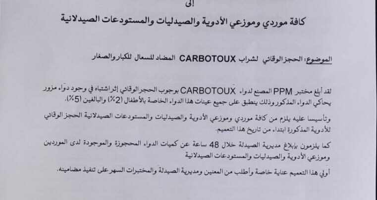 ووفق تعميم للوزارة فقد أبلغ مختبر PPM المصنع لدواء CARBOTOUX بوجوب الحجز الوقائي إثر الاشتباه في وجود دواء مزور يحاكي الدواء المذكور.