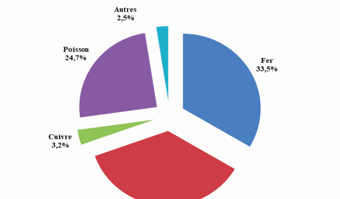 ويضيف التقرير أن قيمة الصادرات من الحديد في الفترة ذاتها بللغت 11,2 مليار أوقية جديدة، وهو ما يمثل نسبة %33,5 من مجموع الصادرات.