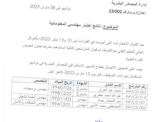 ودعا الشركة، في بيان لها، المعنيين إلى الاتصال بقطاع التسيير الاستشرافي للمصادر البشرية في نواذيبو، لاستكمال إجراءات التوظيف قبل يوم 15 مارس الجاري كآخر أجل