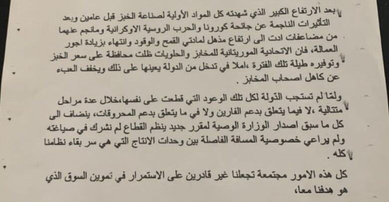 لوحت الاتحادية الموريتانية للمخابز والحلويات بالتوقف عن إنتاج الخبز ابتداء من الاثنين القادم (الساعة: 00:00) في حال لم تقم الحكومة بتدخل عاجل لحل قضايا سردتها الاتحادية.