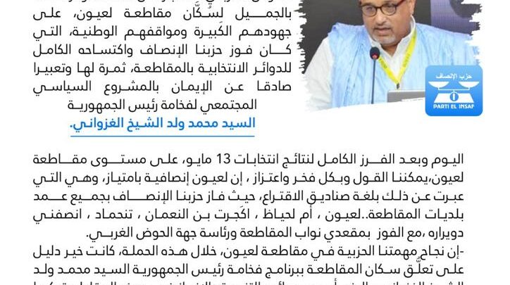 إننا في المنسقية المقاطعية لحملة حزب الإنصاف، على مستوى مقاطعة لعيون عاصمة الحوض الغربي ، لنعبر عن امتناننا وعرفاننا بالجميل لِسُكَّان مقاطعة لعيون، على جهودهم الكبيرة ومواقفهم الوطنية، التي كان فوز حزبنا الإنصاف واكتساحه الكامل للدوائر الانتخابية بالمقاطعة، ثمرة لها وتعبيرا صادقا عن الإيمان بالمشروع السياسي المجتمعي لفخامة رئيس الجمهورية السيد محمد ولد الشيخ الغزواني.