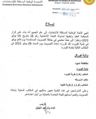 أعلنت اللجنة المستقلة للانتخابات، أنه ونظرا لخطإ مطبعي في بطاقة التصويت المستخدمة يوم فاتح يوليو في بلدية تكوبره، وبناء على قرار المحكمة العليا وتطبيقا لمداولة اللجنة الانتخابية رقم 28 بتاريخ 05 يوليو 2023، فقد تقرر إعادة التصويت في بعض مكاتب البلدية يوم السبت 08 يوليو 2023.
