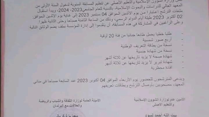أعلنت وزارة الشؤون الإسلامية والتعليم الأصلي عن تنظيم المسابقة السنوية لدخول السنة الأولى من المعهد العالي للدراسات والبحوث الإسلامية، ومسابقة دخول السنة الأولى من المحظرة الشنقيطية الكبرى في أكجوجت بالنسبة للعام الجامعي 2023، 2024.