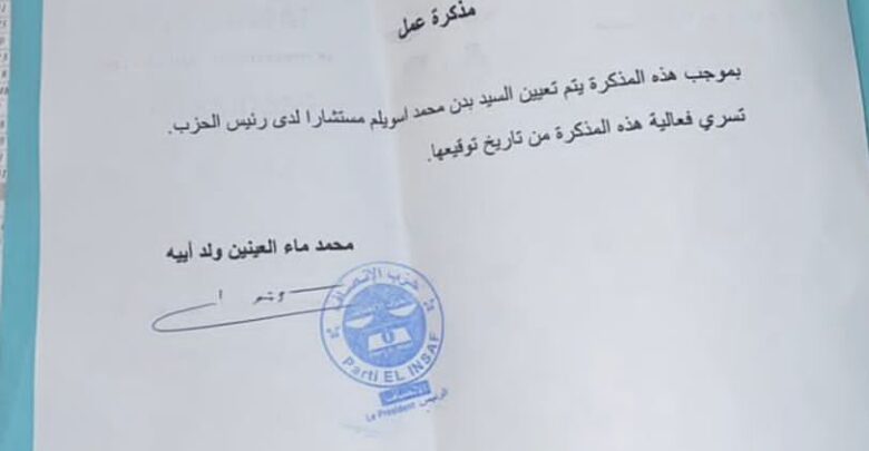 تعيين السيد بدن محمد أسويلم مستشارا لرئيس حزب الانصاف يذكر أن المستشار إطار و مستشار في مفوضية الأمن العذائي