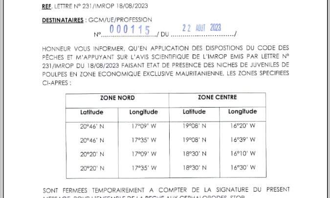 قررت وزارة الصيد والاقتصاد البحري إتخاذ قرار بإغلاق مؤقت للمنطقة الشمالية والمنطقة الوسطى ، بفعل ما قالت إنه تقرر من المعهد الموريتاني لبحوث المحيطات والصيد أظهر وجود صغار الأخطبوط في المنطقتين بأعداد كبيرة.