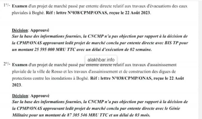 أجازت لجنة مراقبة الصفقات العمومية أمس الجمعة، صفقة تتعلق بالصرف الصحي لمياه الأمطار في مدينة روصو عاصمة ولاية ترارزة، وبناء سدود للوقاية من الفيضانات في بوغي بولاية لبراكنة.