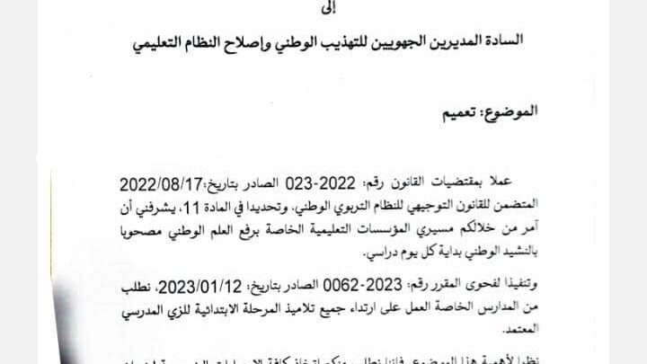وجهت الأمانة العامة لوزارة التهذيب الوطني، رسالة إلى المديرين الجهويين للوزارة تأمرهم فيها برفع العلم مصحوبا بالنشيد الوطني مع بداية كل يوم دراسي.