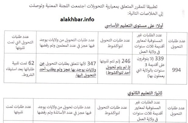 وأكدت الوزارة في توضيح صادر عنها أن اللجنة المعنية بالتحويلات تلقت 994 طلب تحويل على مستوى التعليم الأساسي، و557 طلب تحويل على مستوى التعليم الثانوي، حيث رفضت 339 طلب تحويل على مستوى التعليم الأساسي لأن من قدموها لا يتوفرون على أقدمية ثلاث سنوات في الولاية التي يعملون فيها.