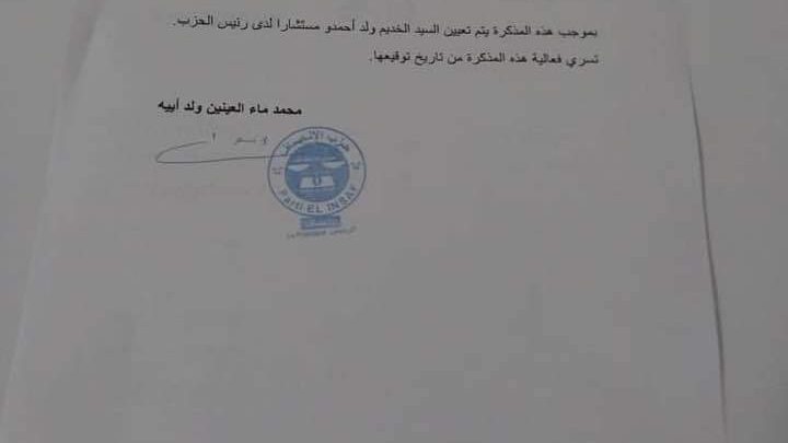 تعيين الاطار في وزارة الاسكان الخديم ولد احمدو مستشارا لرئيس حزب الانصاف