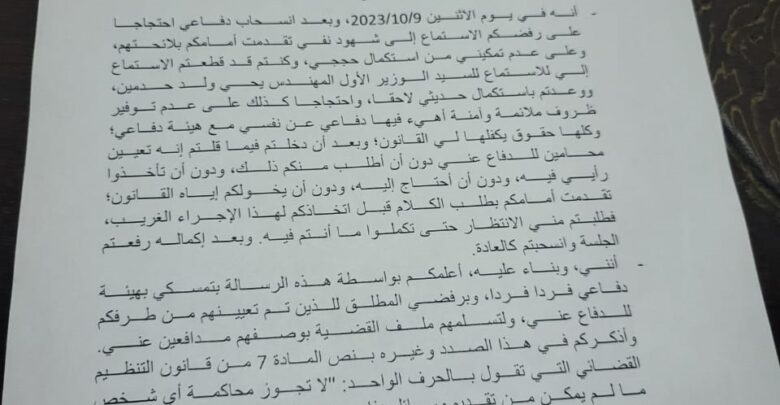 رسالة للرئيس السابق علن فيها بتمسك بدفاعه ويرفض تسليم ملفه لمحامين عينتهم المحكمة