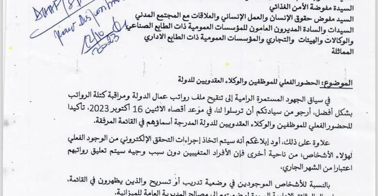 ووجه الوزير تعميمه إلى الوزراء، وإلى مندوب تآزر، وإلى مفوضة الأمن الغذائي، ومفوض حقوق الإنسان، ومديري المؤسسات العمومية ذات الطابع الصناعي والتجاري، والوكالات والهيئات والمؤسسات ذات الطابع الإداري المماثلة