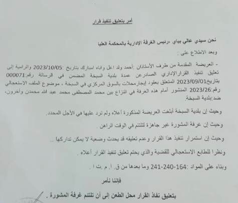 وعللت الغرفة أمرها بأن البلدية أبلغت بالعريضة ولم ترد في الأجل المحدد، وأن غرفة المشورة غير جاهزة لتلتئم في الوقت الراهن، وأن استمرار تنفيذ القرار قد يحدث وضعية لا يمكن تداركها، إضافة إلى الطابع الاستعجالي للقضية.