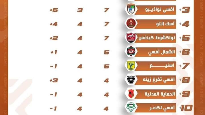 صدارة الدوري الموريتاني بعد ختام الجولة الرابعة في يد رجال الجمارك والمركز الثاني لصالح رجال الدرك ونواذيبو ثالثا مع مباراة مؤجلة والقاع من نصيب كيهيدي والكونكورد