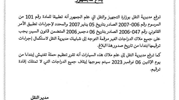 كما ترفع مديرية النقل إلى علم ملاك هذه السيارات أنه تقرر تنظيم حملة تفتيش إبتداءا من يوم الإثنين 06 نوفمبر 2023 سيتم بموجبها إيقاف جميع الدراجات التي لا تمتلك إفادة ترقيم.