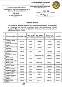 بموجب مذكرة عمل صادرة عن الامين العام لوزارة التهذيب الوطني تم تحويل عشرات المفتشين المقاطعيين الى أماكن عمل جديدة، وقد اظهرت الائحة تحويل 63 مفتشا