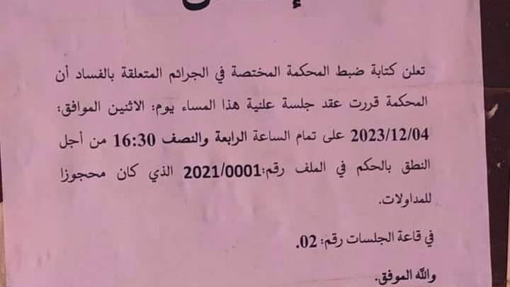 الرئيسية/منوعات/النطق بالحكم في ملف العشرية سيكون هذا المساء منوعات النطق بالحكم في ملف العشرية سيكون هذا المساء اظهر المزيد شاركها فيسبوك X واتساب مشاركة عبر البريد طباعة