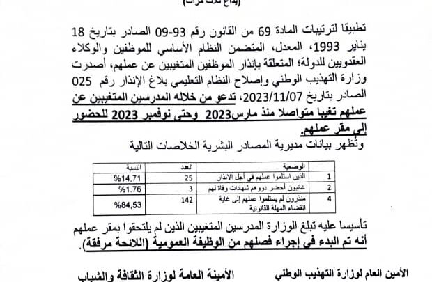 وقالت الوزارة إنه تطبيقا للمادة: 69 من القانون رقم: 93-09 الصادر بتاريخ: 18 يناير 1993، المعدل، المتضمن النظام الأساسي للموظفين والوكلاء العقدويين للدولة، أصدرت بلاغا يتضمن إنذارا، دعت من خلاله المدرسين المتغيبين عن عملهم تغيبا متواصلا منذ مارس 2023 وحتى نوفمبر 2023 للحضور إلى مقر عملهم.