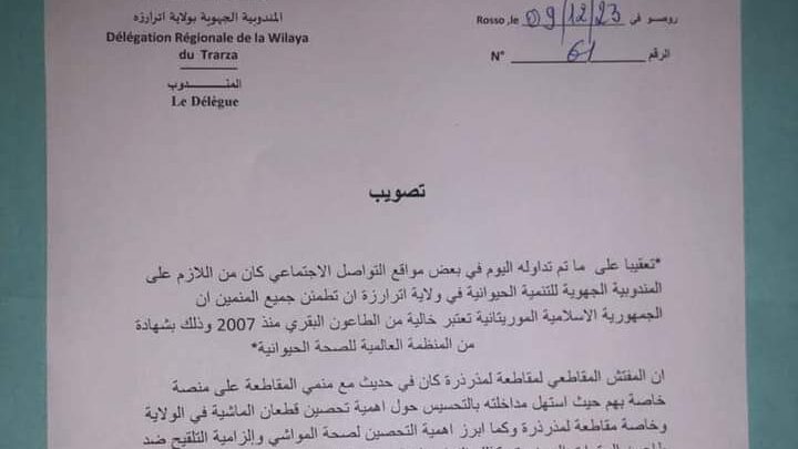 جاء ذلك في بيان صادر عن المندوبية، تعقيبا على تصريح للمفتش البيطري المقاطعي لمقاطعة المذرذرة، تم تداوله في بعض مواقع التواصل الاجتماعي.