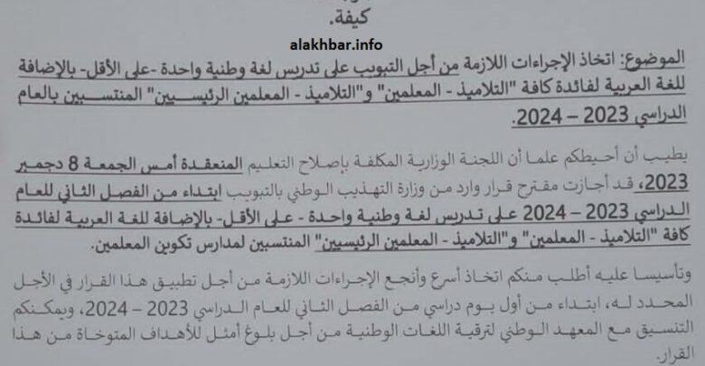 وأكد الوزير ضرورة اتخاذ أسرع وأنجع الإجراءات اللازمة من أجل تطبيق هذا القرار، في الأجل المحدد له، أي ابتداء من أول يوم دراسي من الفصل الدراسي الثاني، ونبههم إلى إمكانية التنسيق مع المعهد الوطني لترقية اللغات الوطنية من أجل بلوغ الأهداف المتوخاة من هذا القرار.